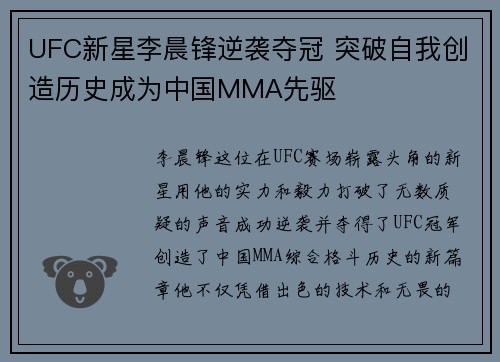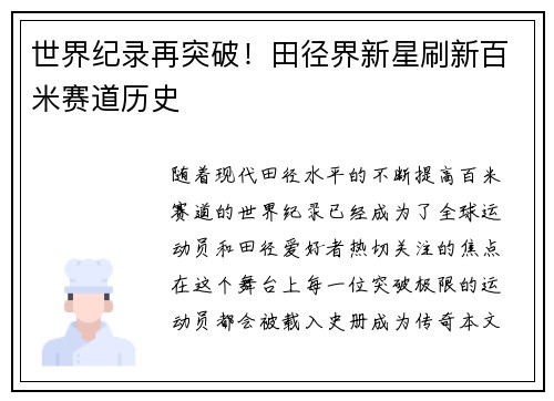 文章摘要:中国短跑新星的崛起,不仅为中国田径注入了新的活力,也为世界短跑历史书写了新的篇章。近日,一名中国年轻运动员在百米赛跑中突破极限,打破了由贾斯汀·加特林保持的百米世界纪录,成功创下了新的历史。这一突破不仅是中国田径领域的一次历史性胜利,更为全球体育竞技带来了深远的影响。本文将从四个方面详细探讨这一事件:首先是中国短跑新星的训练背景与成长历程,其次是突破极限的关键因素,包括技术、体能、心理素...