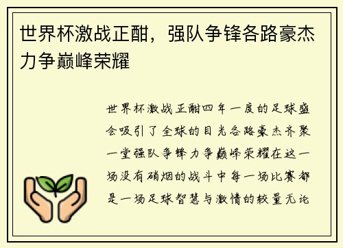 文章摘要:随着全球各国运动员齐聚世界锦标赛的赛场,激烈的角逐正在如火如荼地进行。各国顶尖选手为争夺那一枚象征荣耀的奖牌,毫不松懈地挑战自我极限。从运动员们的准备阶段,到赛场上的每一场惊心动魄的对决,再到背后团队的默契合作,每一幕都充满了汗水、拼搏与梦想的印记。本文将从四个方面详细探讨当前世锦赛的激烈状况,分别是:赛场上的对决、选手们的心理博弈、背后支持的力量与团队协作以及赛事的意义与影响。通过这些...
