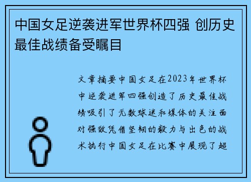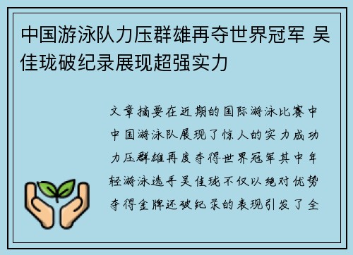 文章摘要:近年来,中国游泳队在国际赛事中的表现越来越引人瞩目,尤其是在个人项目和接力项目中屡创佳绩,展现出强大的竞争力。刘湘作为中国游泳队的杰出代表之一,她在百米蝶泳项目中创造了新的全国纪录,这一成绩不仅刷新了个人纪录,也为中国游泳队在国际舞台上增添了光彩。本文将从四个方面详细分析中国游泳队在国际赛事中的出色表现,特别是刘湘在百米蝶泳项目中的突破,探讨她如何通过不懈努力和技术革新取得如此骄人的成绩...